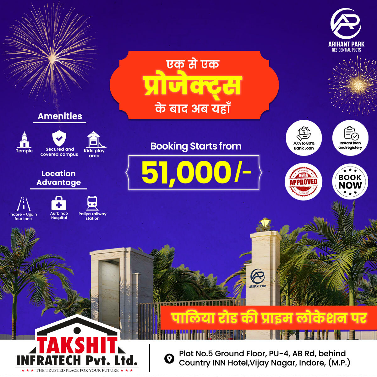 Takshit Infratech Pvt Ltd is an Indore based company started in 2011 For Providing Flexible Solution in real estate and property management. Takshit is dealing with residential and commercial properties form the last 10 years. The Main Aim of Takshit is providing own houses to more than 350+ families every year in affordable prices, for this, the team of experts and the trained professionals are always ready to provide the best solution to the clients.